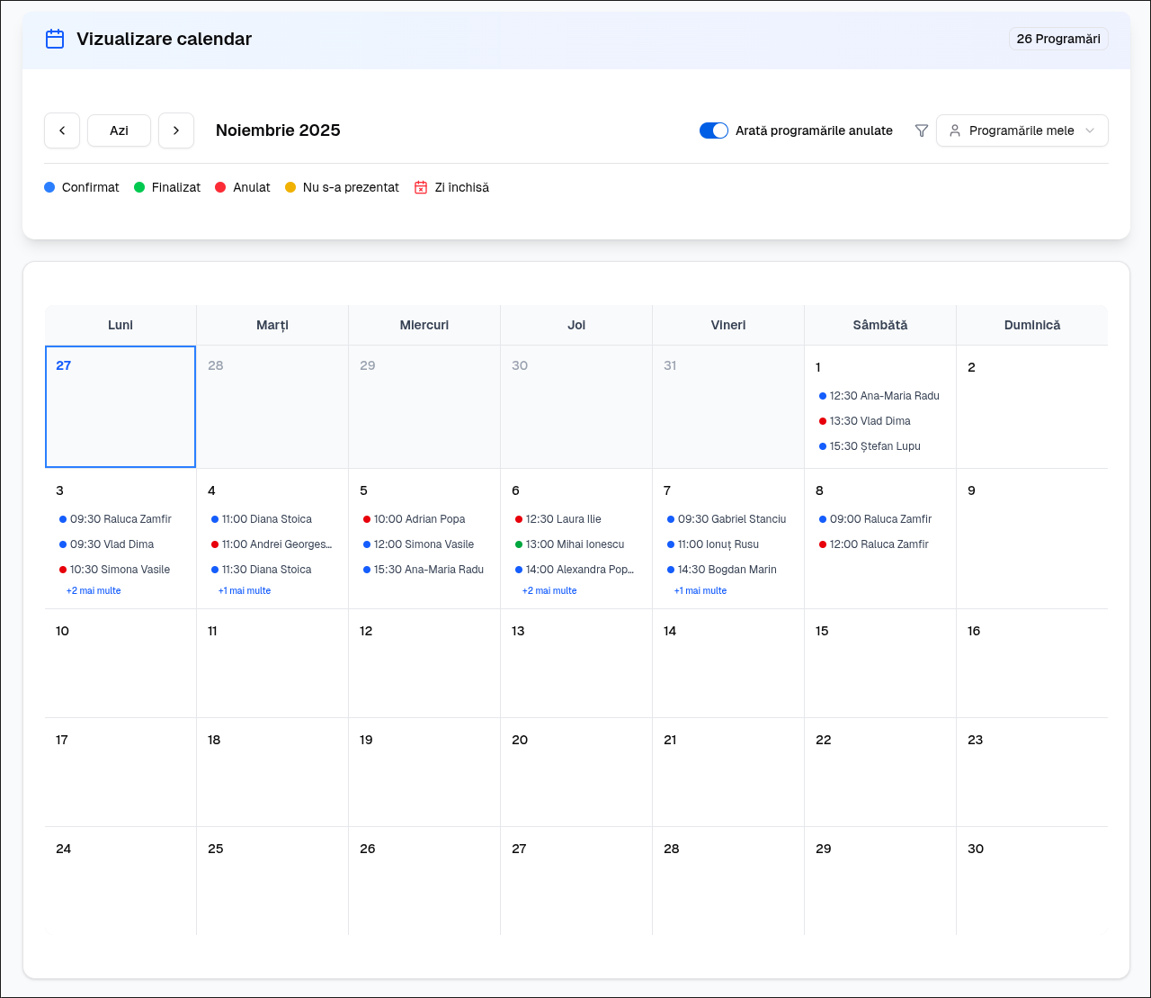 Funcționalități complete pentru saloane, cabinete medicale, centre fitness și orice afacere bazată pe programări.